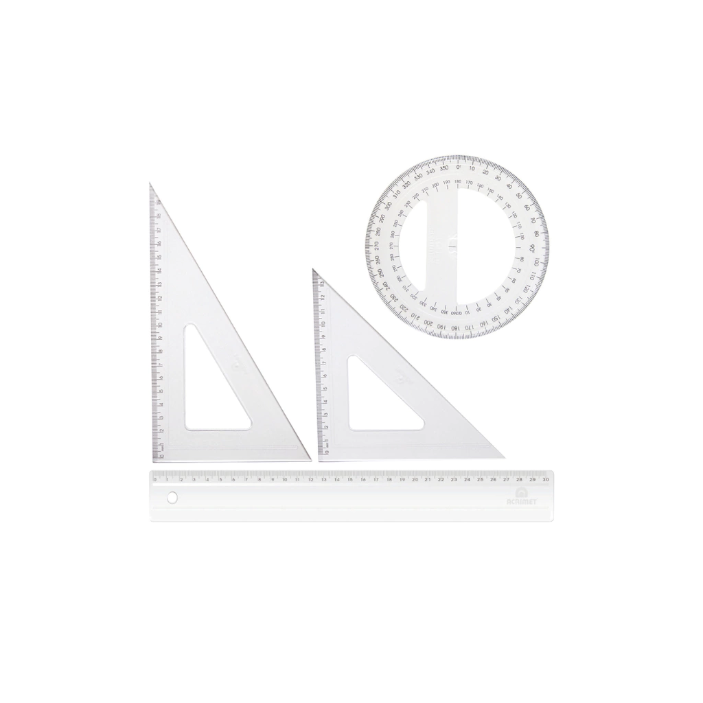 Fabricados em poliestireno, todos os itens possuem escala gravada por transferência de imagem, garantindo alta precisão. Contam com micro ressaltos na face que entra em contato com o papel, evitando o desgaste da escala.