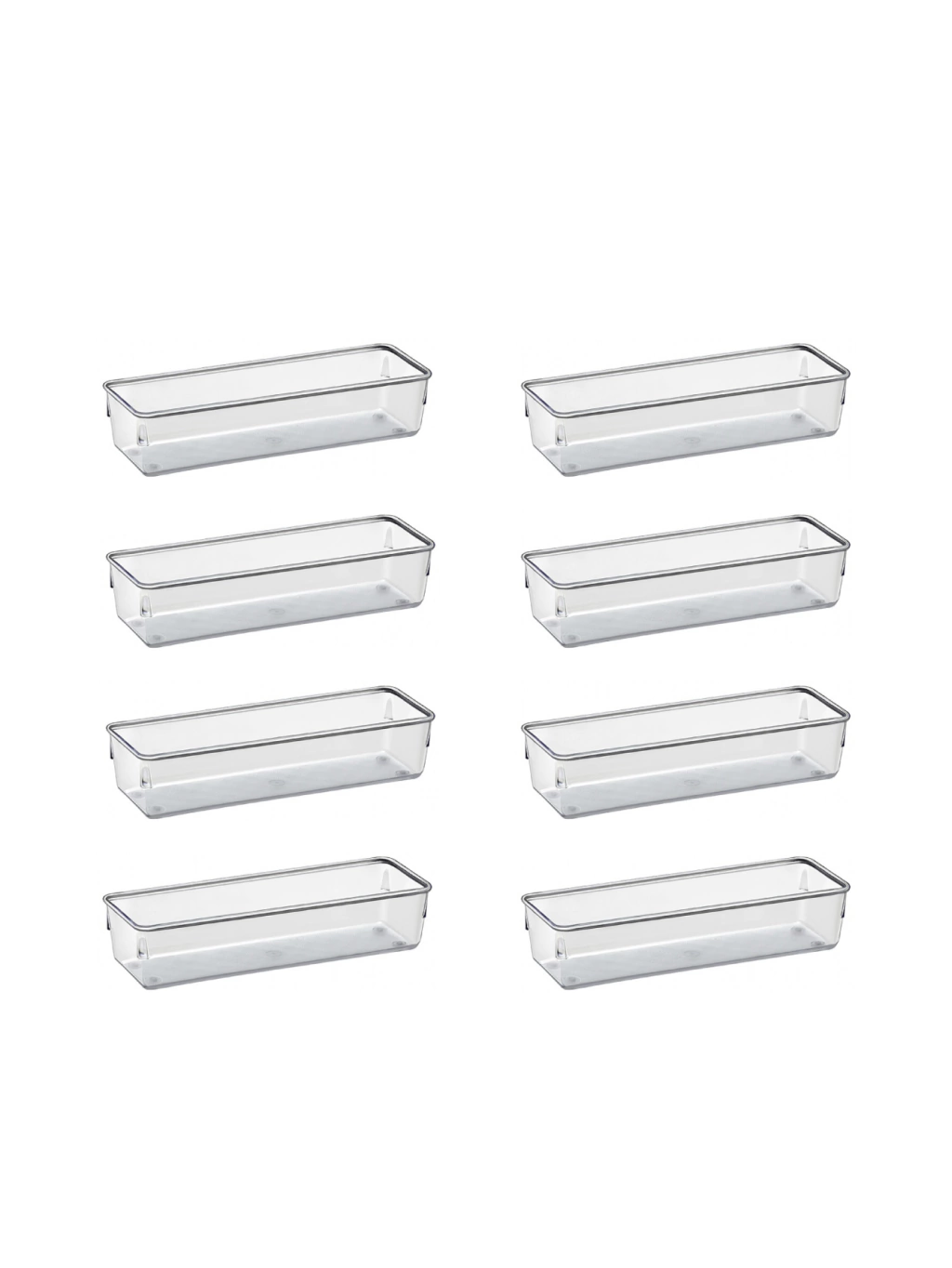 8 potes organizadores medindo 32 cm x 8 cm x 5,5 cm cada